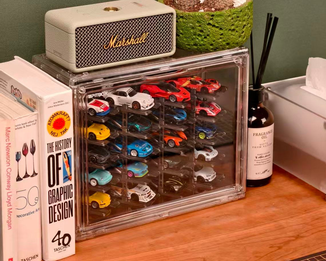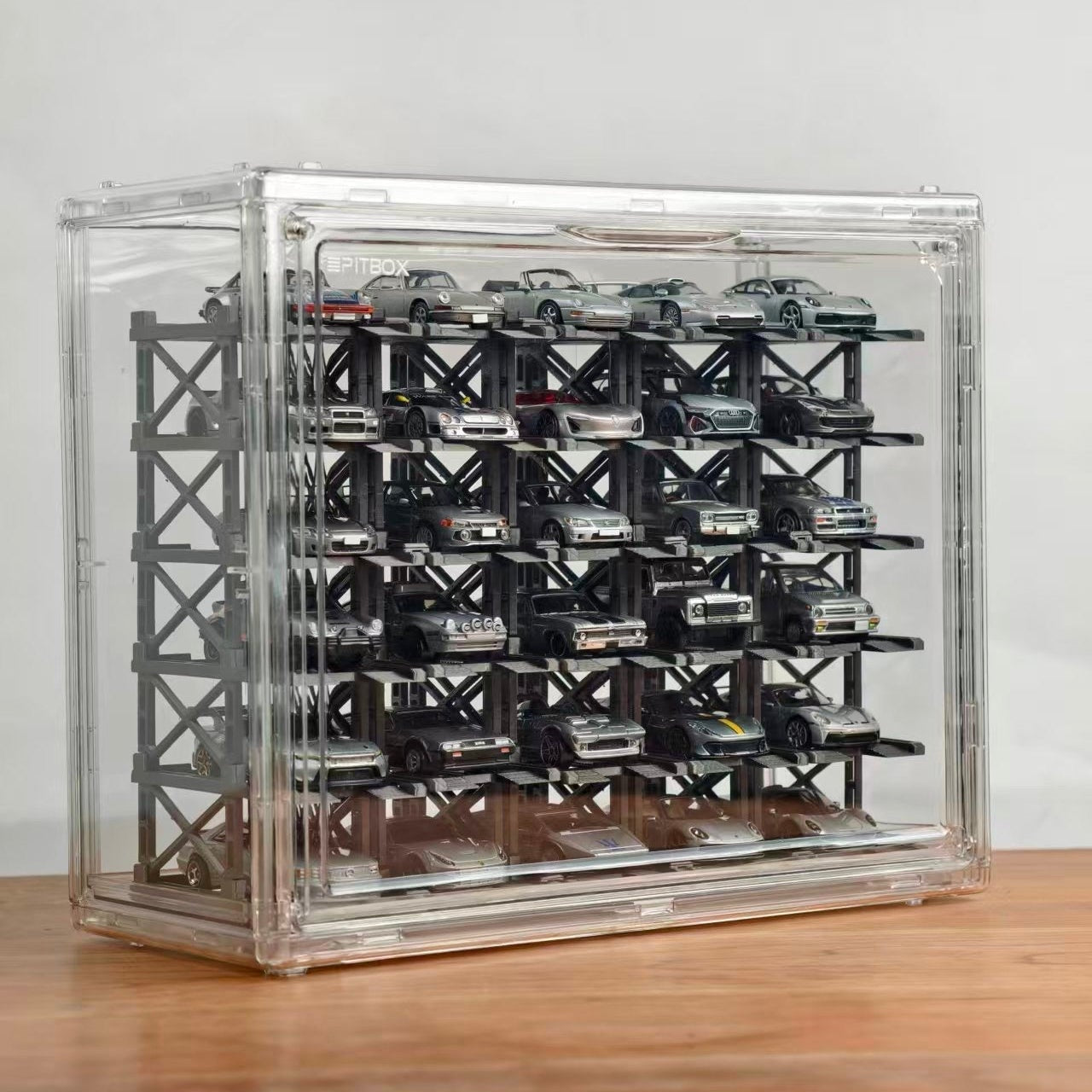 Crystal-clear PET case with a magnetic front door. Choose 20 or 30 parking racks to house your 1:64 fleet—dust-proof, tidy, and ready to show off.