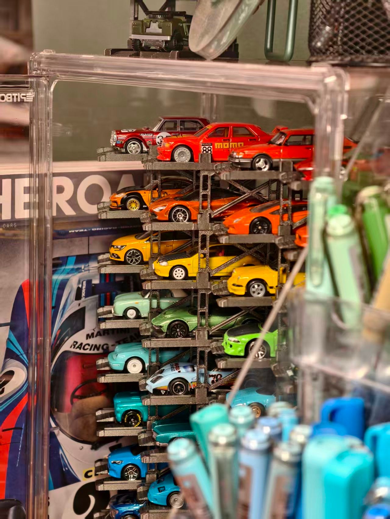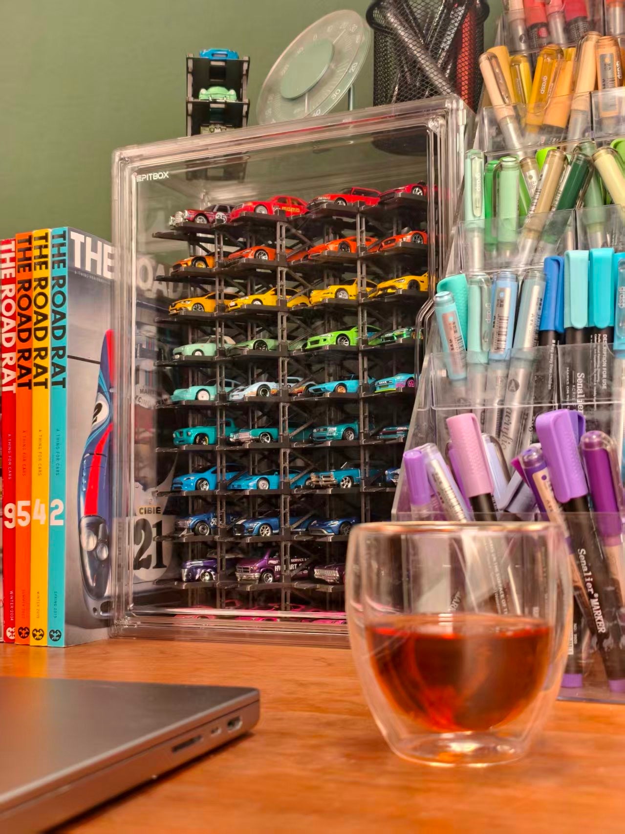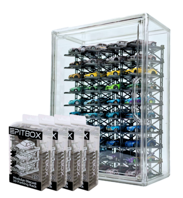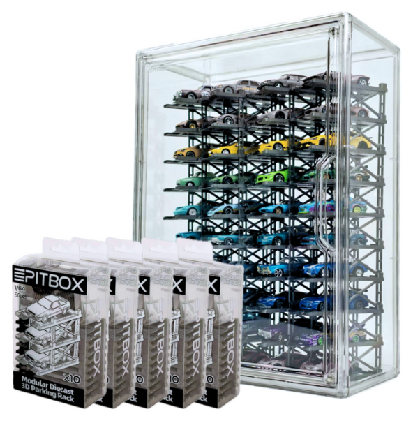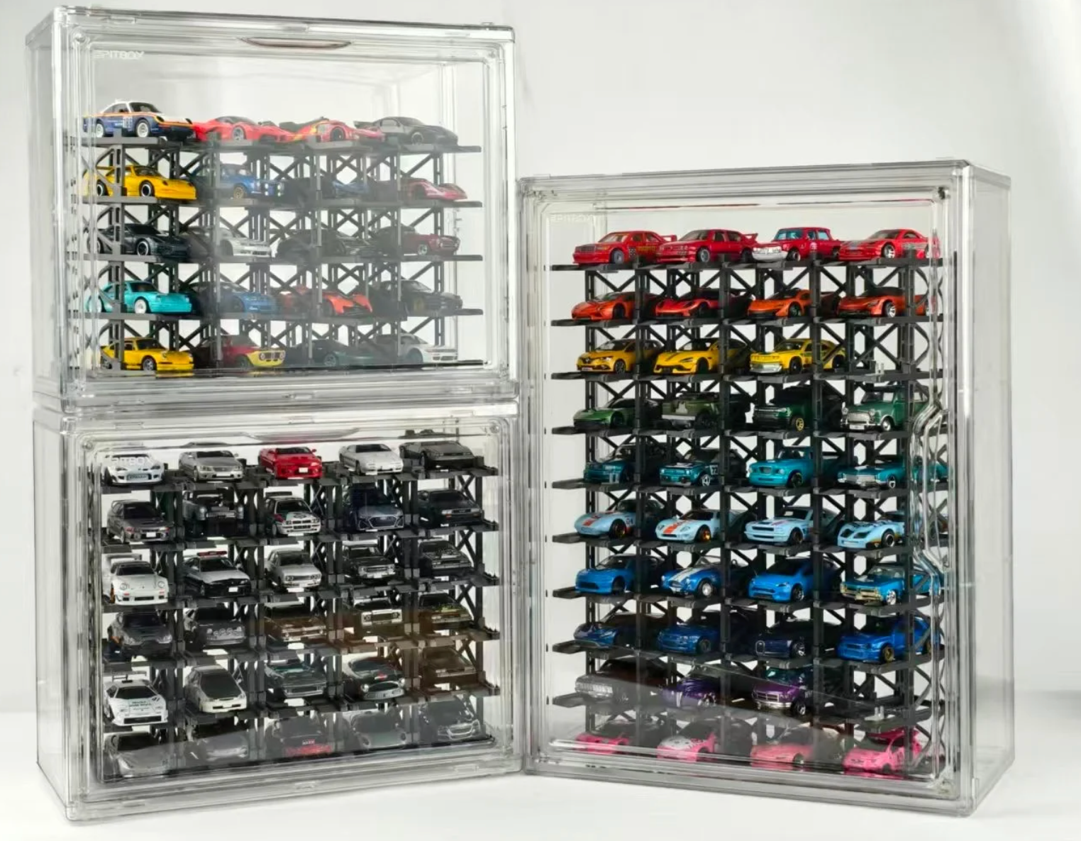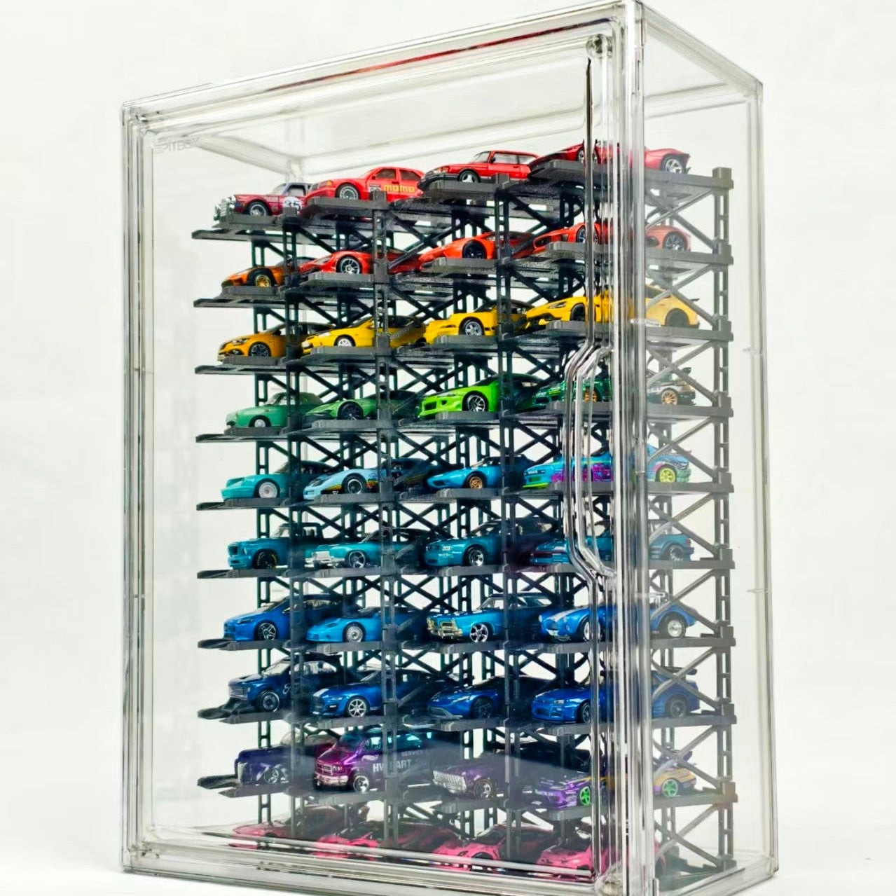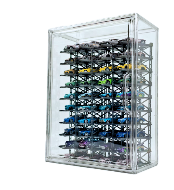 Crystal-clear PET case with a magnetic front door. Choose 40 or 50 parking racks to house your 1:64 fleet—dust-proof, tidy, and ready to show off.