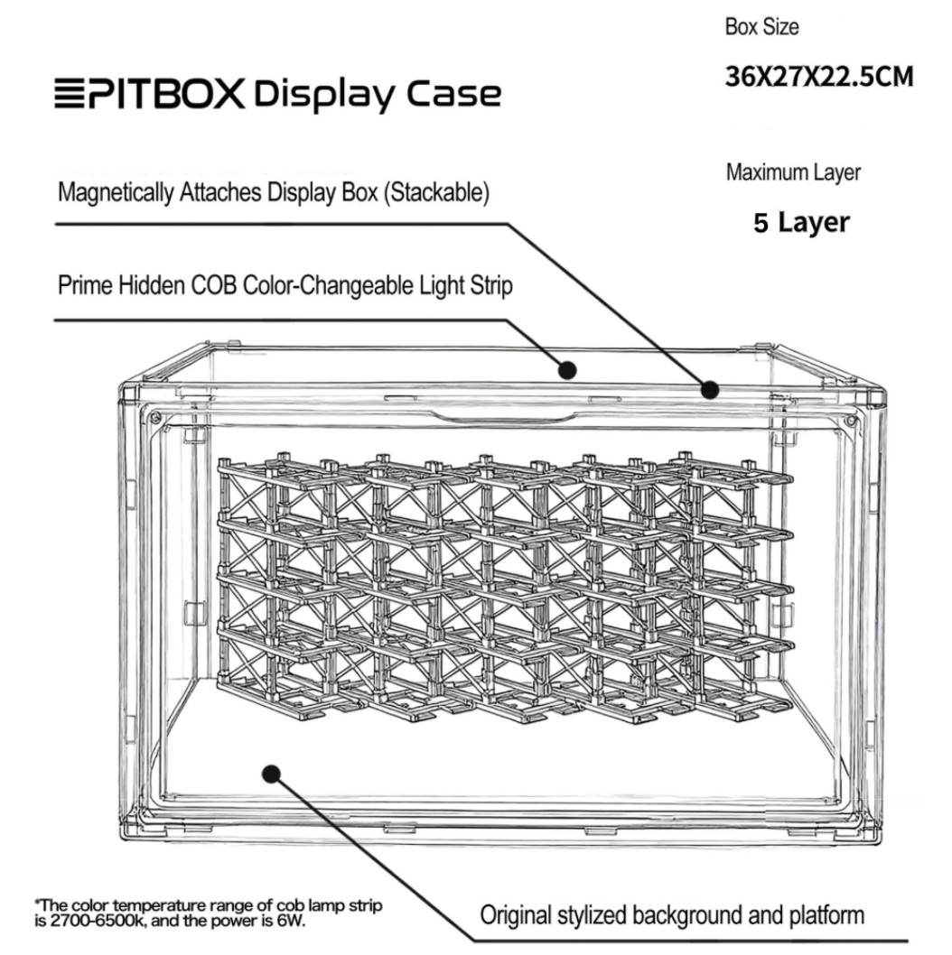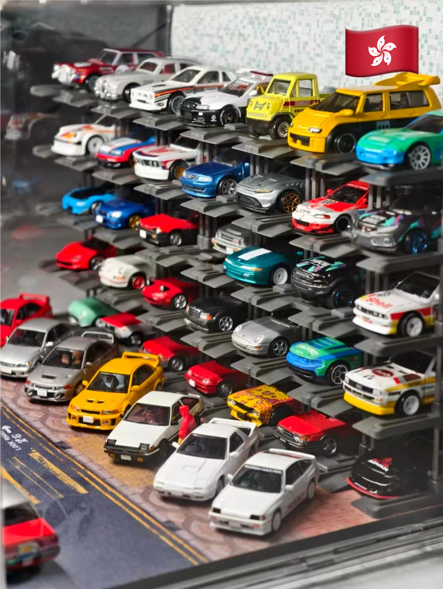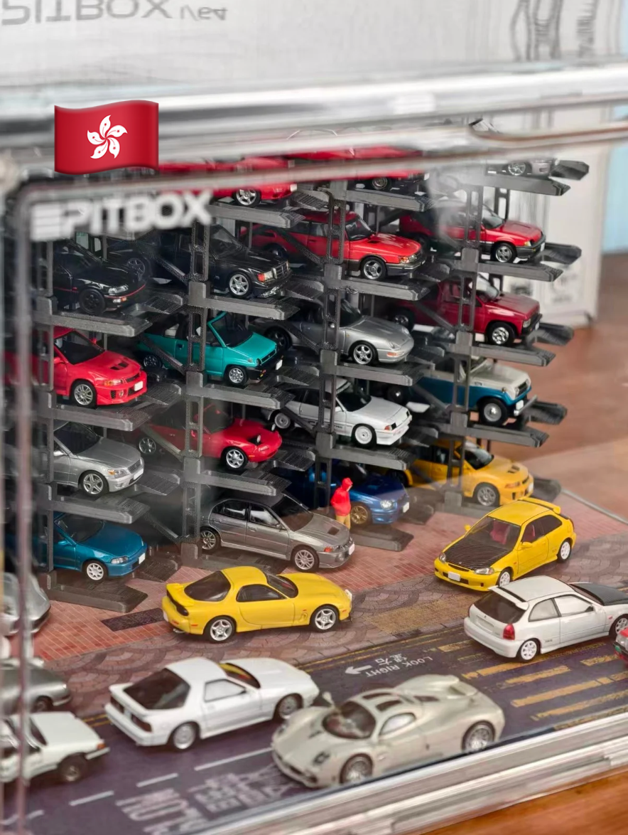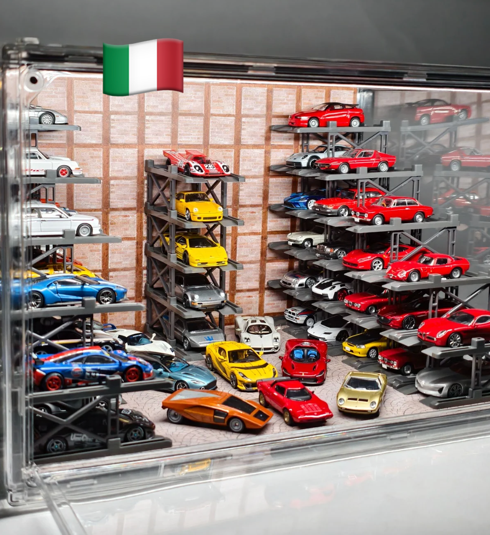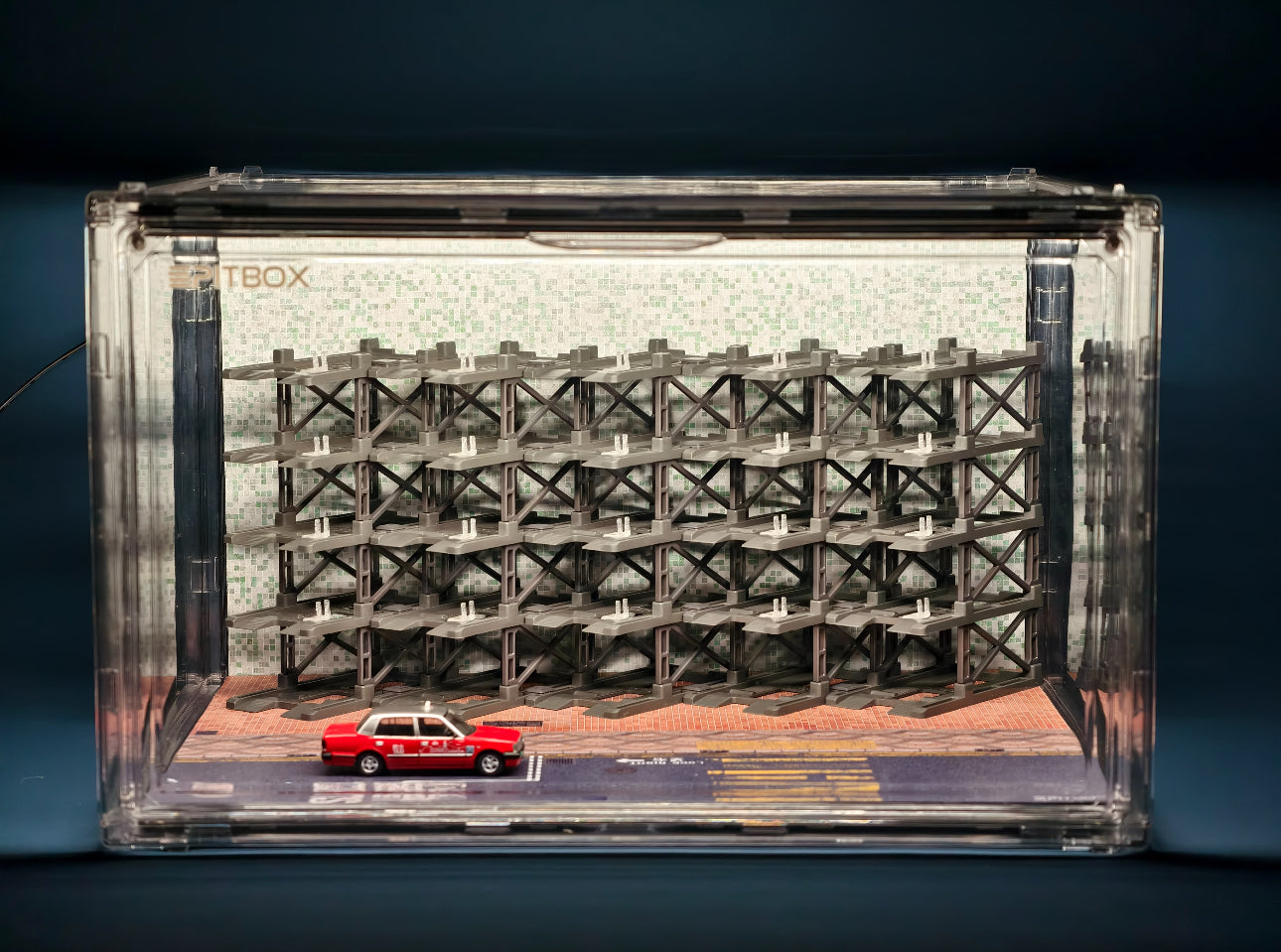 Box contents: Display case (magnetic door), 25 Parking racks, LED strip & power, original stylized background and platform.