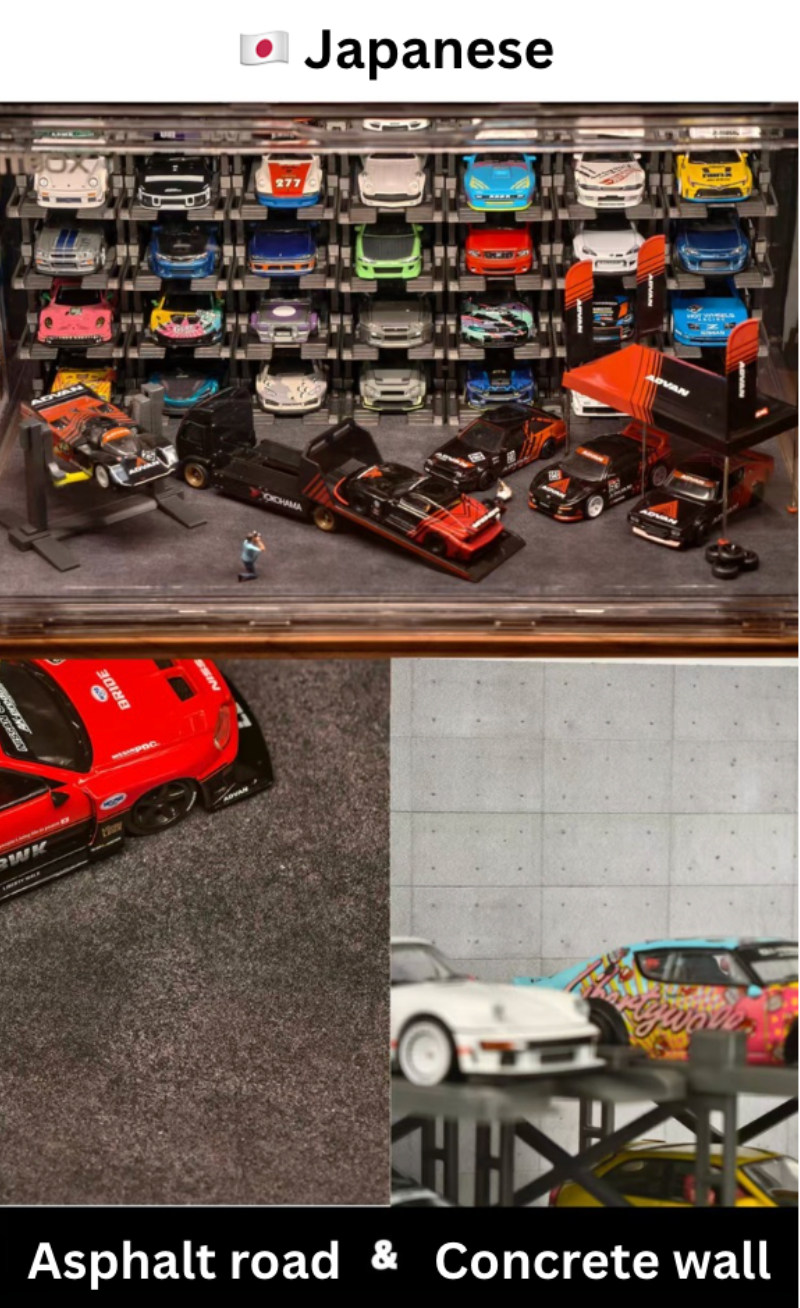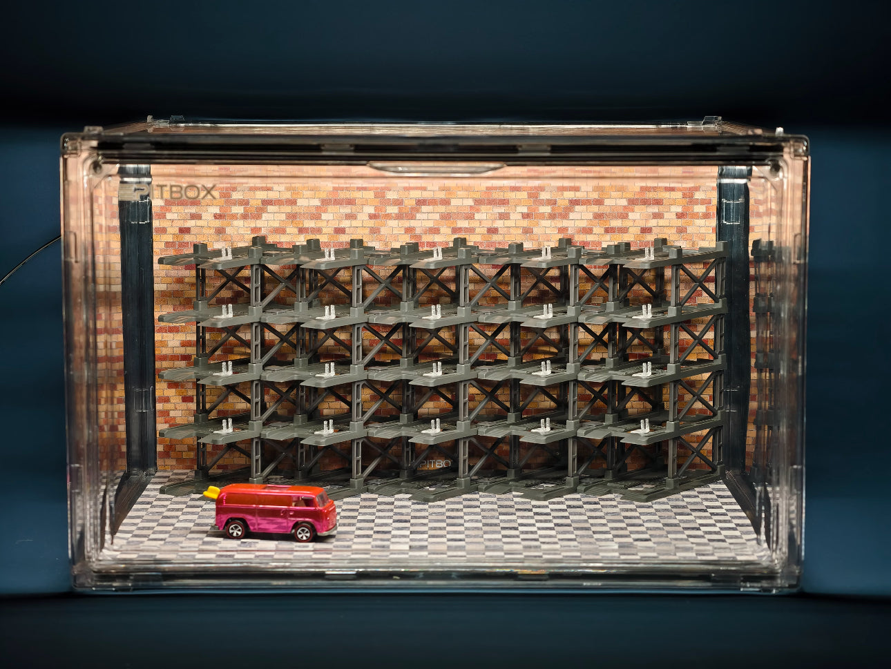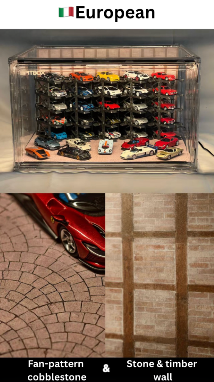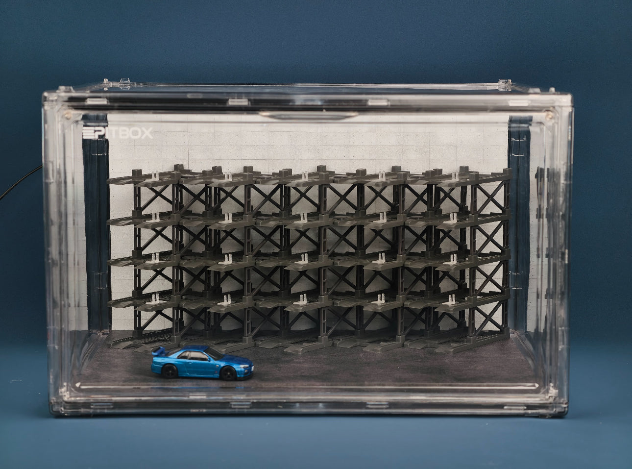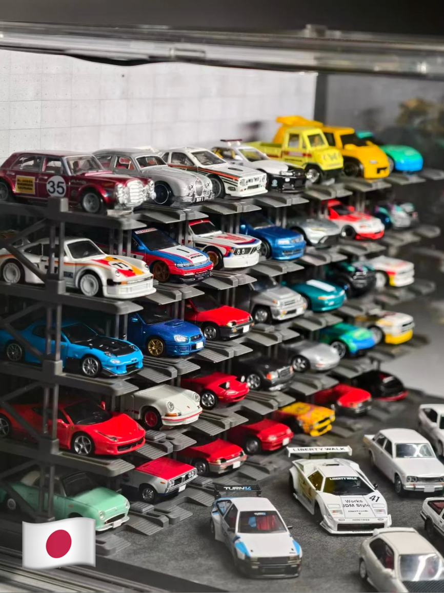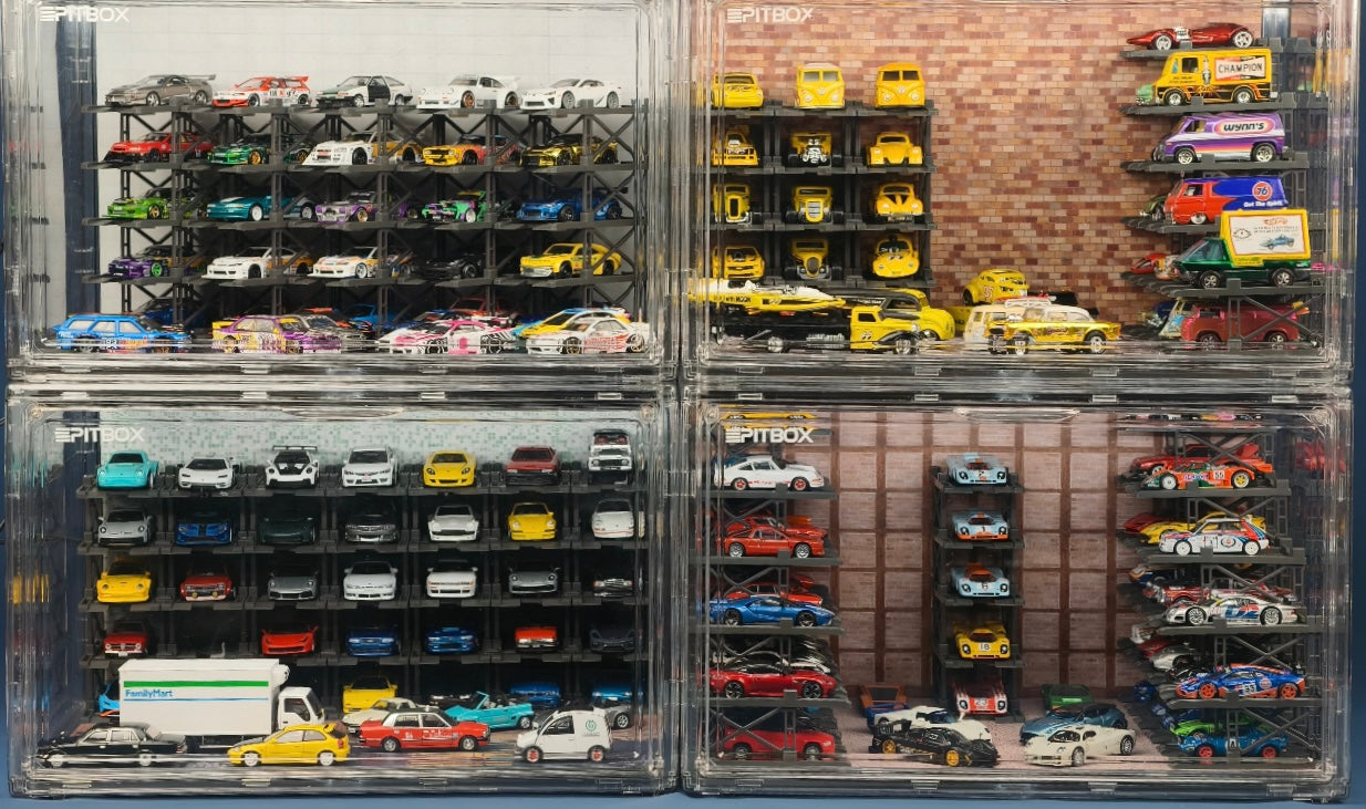 Box contents: Display case (magnetic door), 25 Parking racks, LED strip & power, original stylized background and platform.