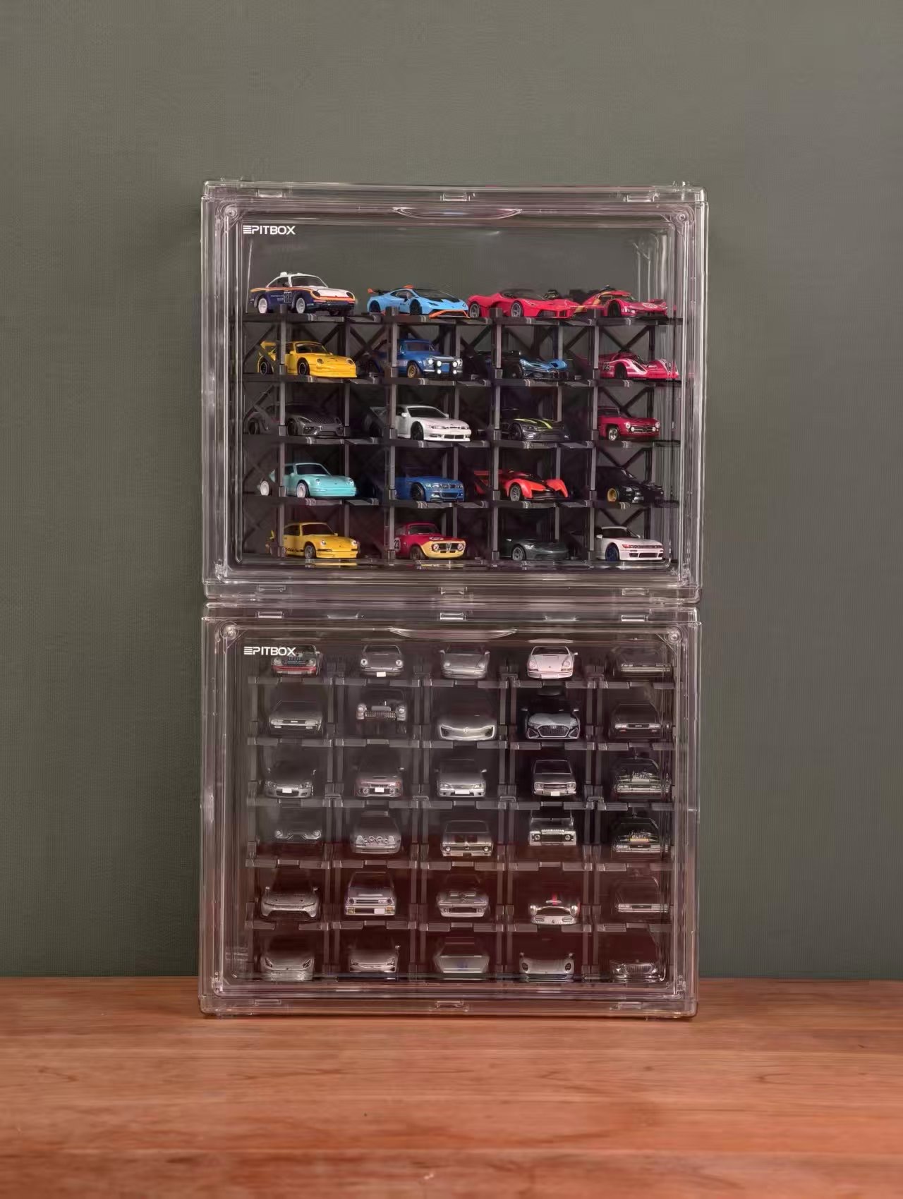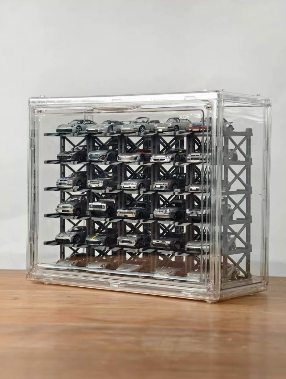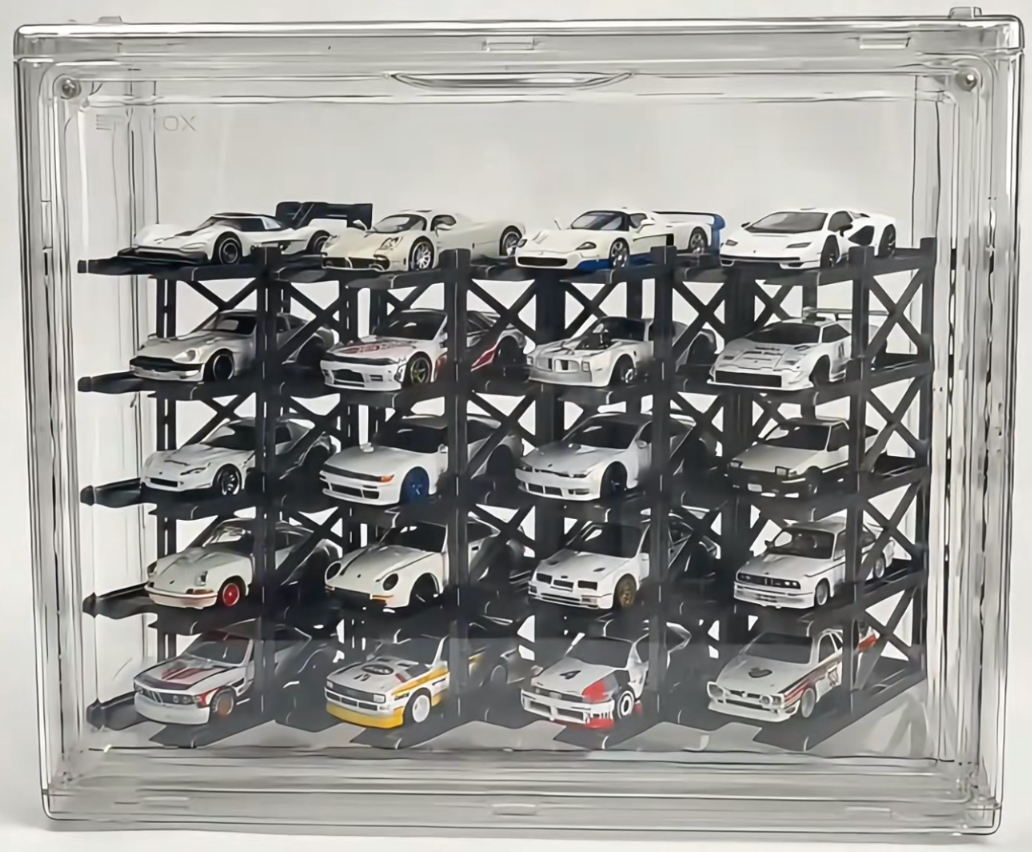 Crystal-clear PET case with a magnetic front door. Choose 20 or 30 parking racks to house your 1:64 fleet—dust-proof, tidy, and ready to show off.
