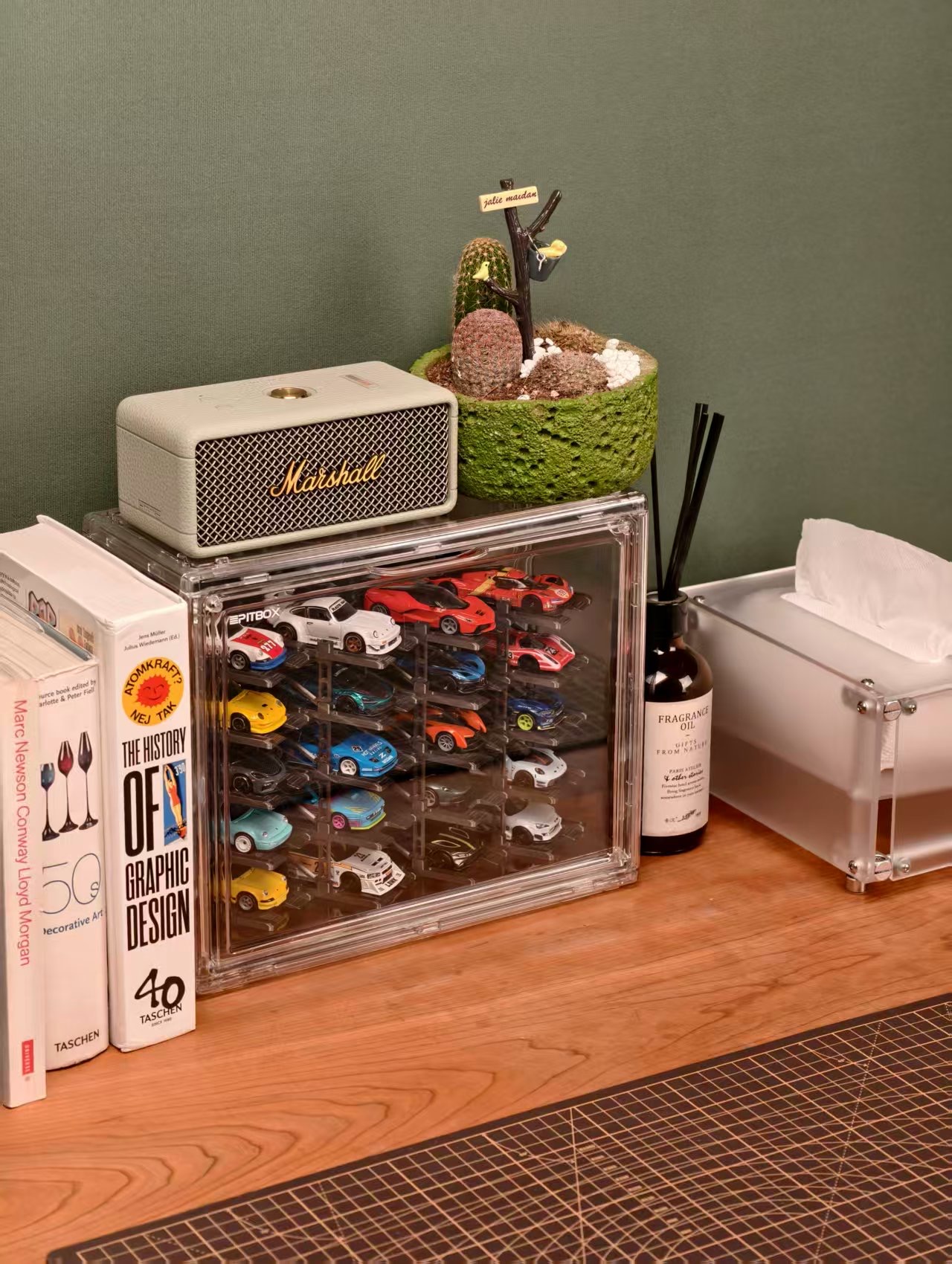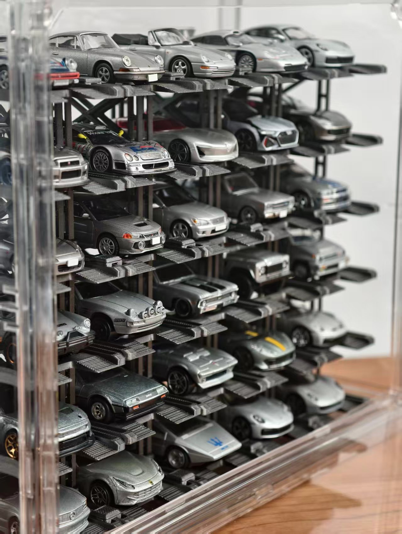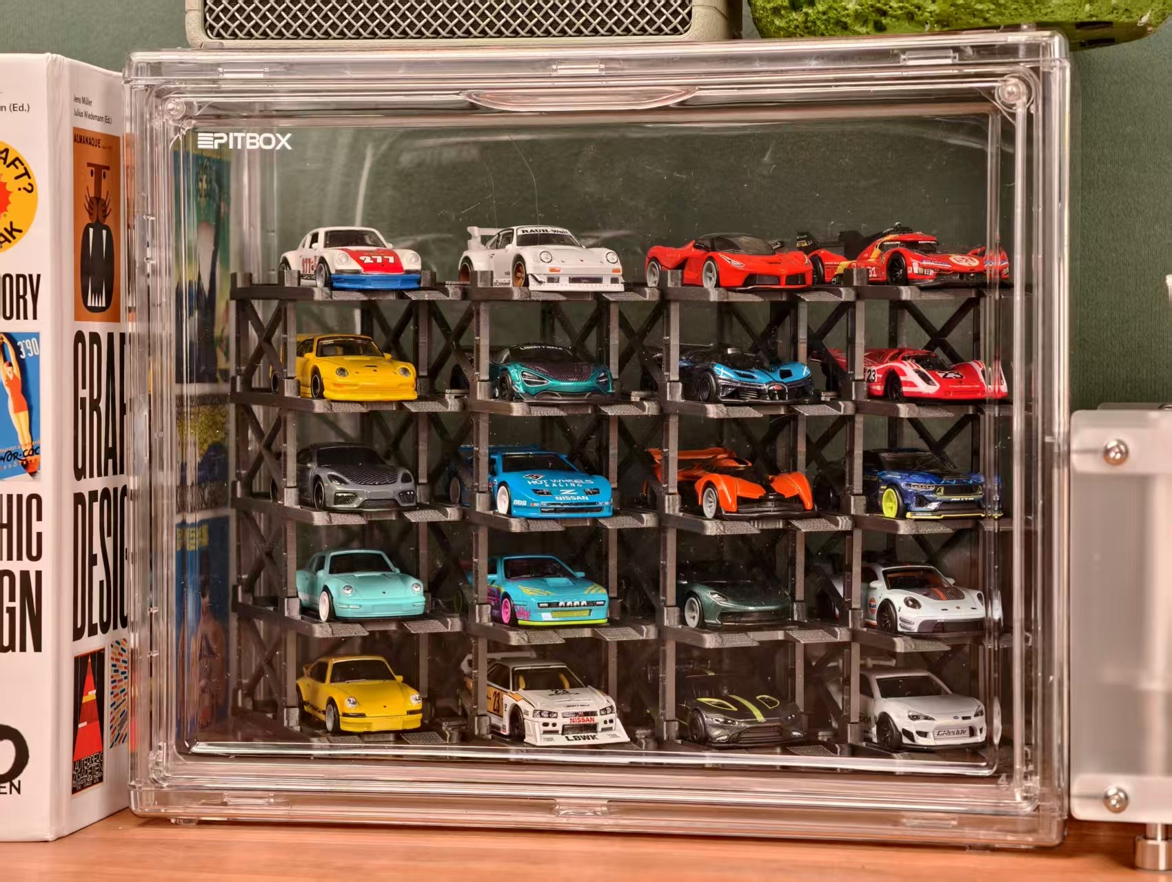 Crystal-clear PET case with a magnetic front door. Choose 20 or 30 parking racks to house your 1:64 fleet—dust-proof, tidy, and ready to show off.